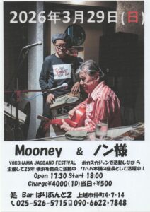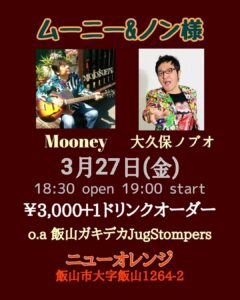 大久保ノブオがムーニーさんと長野ツアーに行きます。【ムーニー&ノン様】3月27日(金)ニューオレンジ(飯山市)長野県飯山市大字飯山1264-2¥3,000+1ドリンクオーダー18:30open 19:00start出演ムーニー大久保ノブオ(ポカスカジャン)飯山ガキデカJugStompers - -