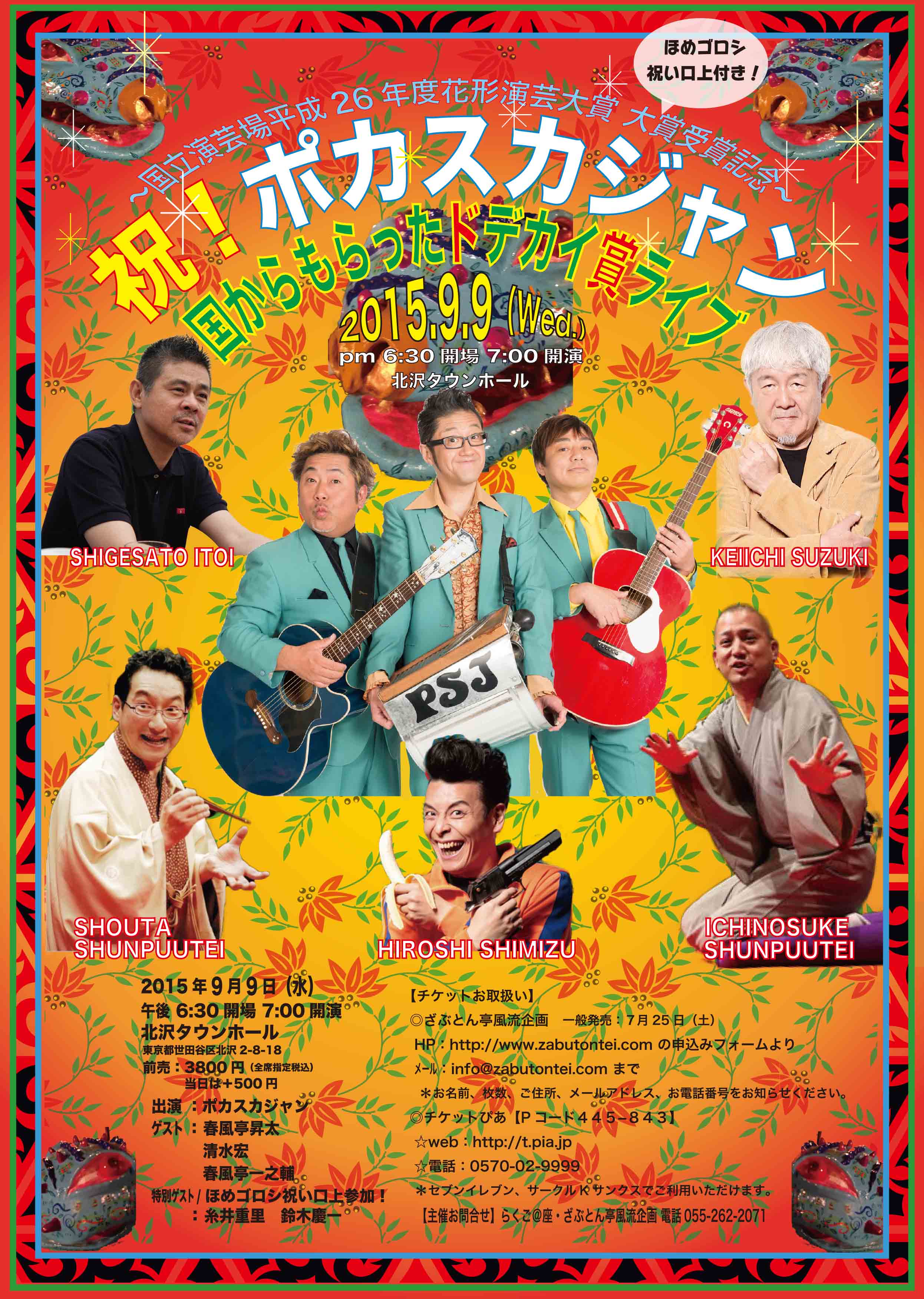 (会場) 北沢タウンホール 住所:東京都世田谷区北沢2-8-18 (料金) 前売:3,800円(全席指定・税込) ※当日はプラス500円 (出演) ポカスカジャン ゲスト:春風亭昇太 清水宏 春風亭一之輔 特別ゲスト:糸井重里 鈴木慶一 ☆祝口上参加! (チケット) ▼ワハハ本舗ファンクラブの会員様用に優先席を確保いたしました。会員の方は7月下旬に発送されますファンクラブ優先予約をご利用ください。 ▼7月15日「第5回ポカスカ寄席」会場にて会場先行予約を行います。 ▼ざぶとん亭先行予約 : 7/18(土)午前10時 ~7/19(日)午後10時まで ざぶとん亭風流企画HP、メールにて受付 ▼一般発売 7月25日(土) ◎ざぶとん亭風流企画 HP : http://www.zabutontei.com の申込みフォームよりメー ル:info@zabutontei.com まで *お名前、枚数、ご住所、メールアドレス、お電話番号をお知らせください。 ◎チケットぴあ【Pコード445-843】 web : http://t.pia.jp / 電話:0570-02-9999 *セブンイレブン、サークルKサンクスでご利用いただけます。 (主催・お問合せ) ざぶとん亭風流企画 電話:055-262-2071