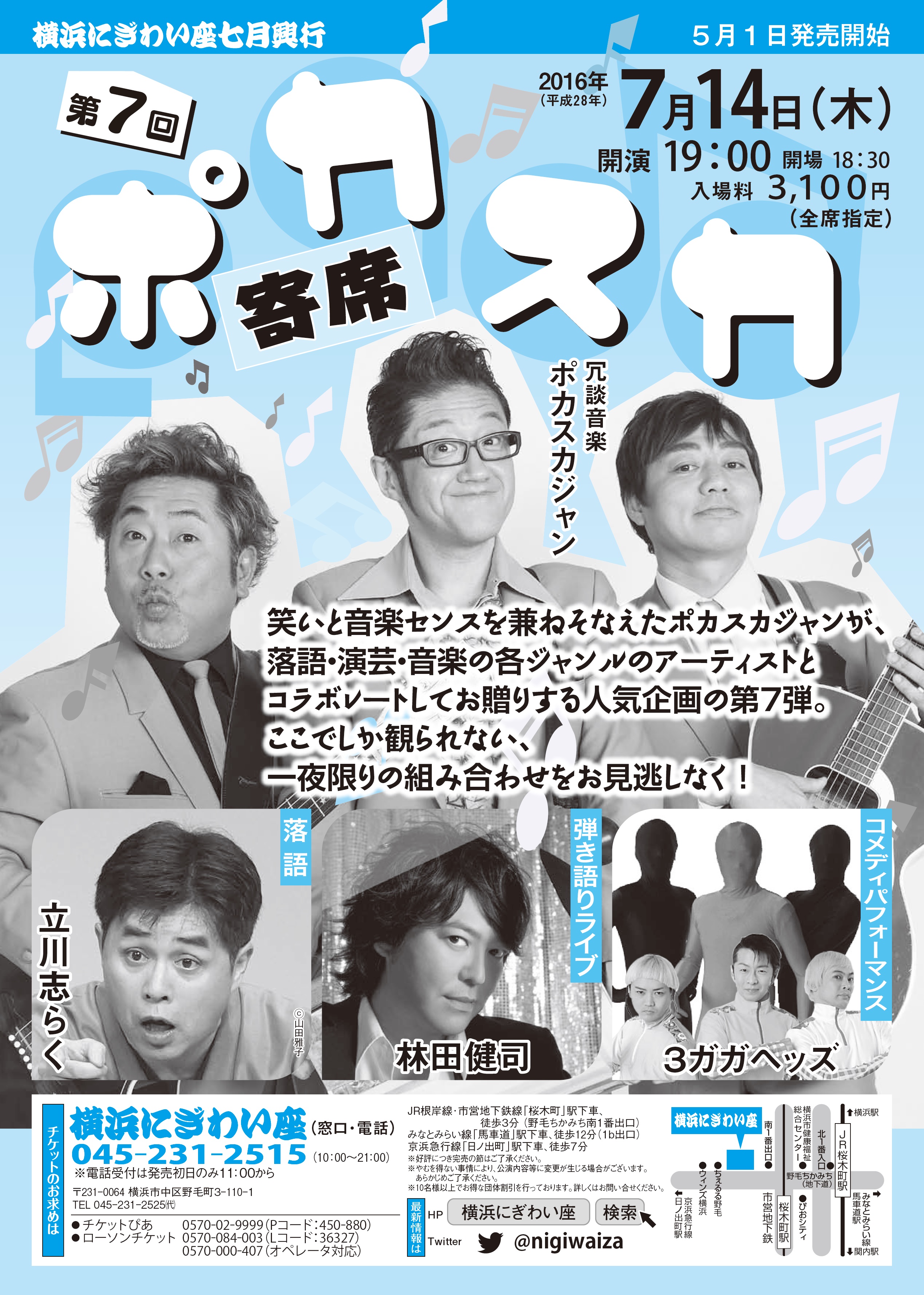 (会場) 横浜にぎわい座 芸能ホール 住所:神奈川県横浜市中区野毛町3-110-1 TEL:045-231-2525 (出演) 冗談音楽 ポカスカジャン 落語 立川志らく 弾き語りライブ 林田健司 コメディパフォーマンス 3ガガヘッズ (金額) 全席指定 3,100円 (チケット)5/1(日)発売開始 横浜にぎわい座 電話(045-231-2515) チケットぴあ(Pコード:450-880) ローソンチケット(Lコード:36327) (主催・お問い合わせ)横浜にぎわい座 TEL:045-231-2525 HP:http://nigiwaiza.yafjp.org/